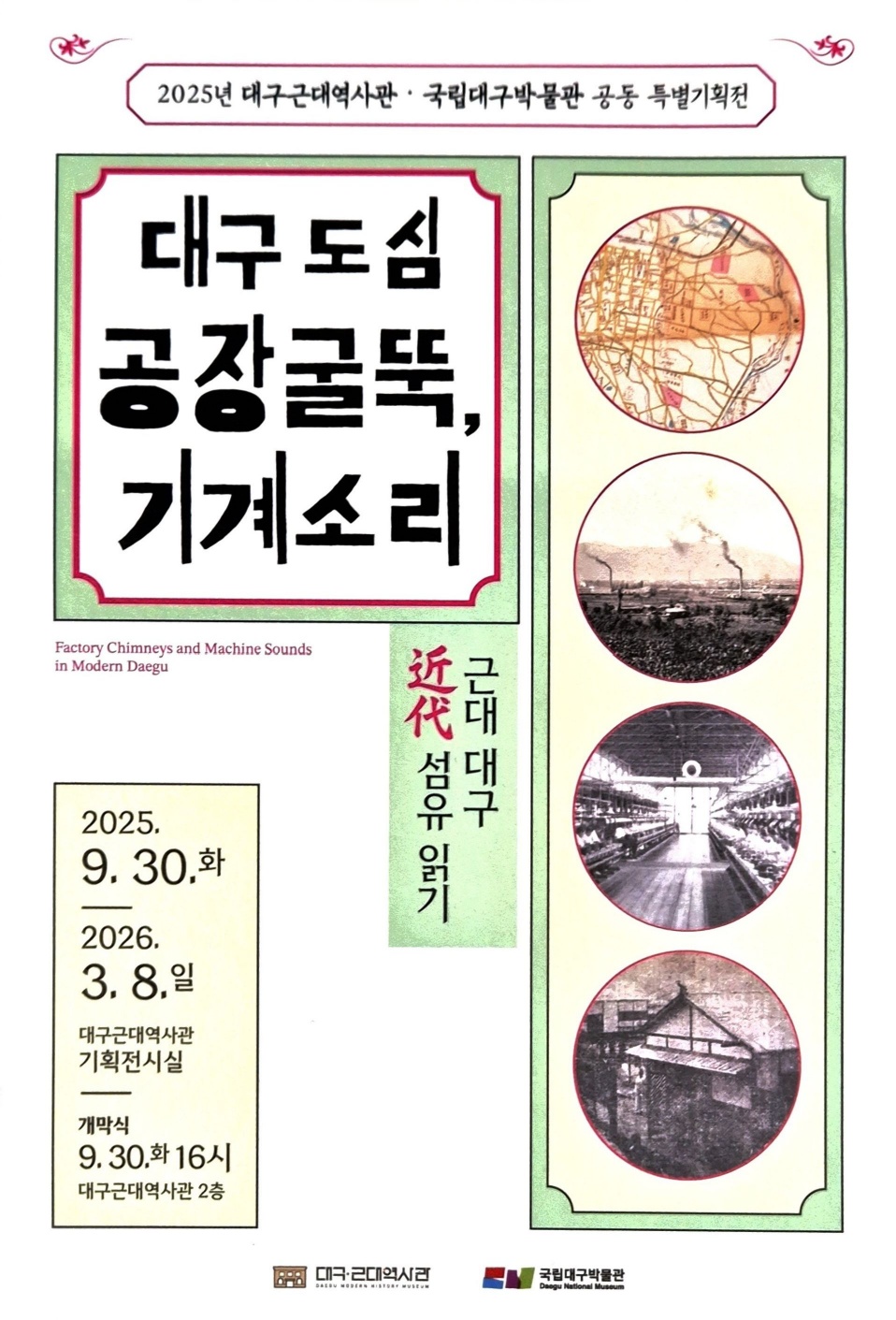 2025년 대구 근대역사관‧국립대구박물관 <대구 도심 공장굴뚝, 기계소리-近代 대구 섬유 읽기>공동 특별기획전을 개최합니다. ●전 시 명 : 2025년 대구 근대역사관‧국립대구박물관 <대구 도심 공장굴뚝, 기계소리-近代 대구 섬유 읽기>공동 특별기획전 ●전시장소 : 대구근대역사관 기획전시실 ●전시기간 : 2025년 9월 30일(화)~2026년 3월 8일(일) ●개막식 : 9월 30일(화)16시 대구근대역사관 2층