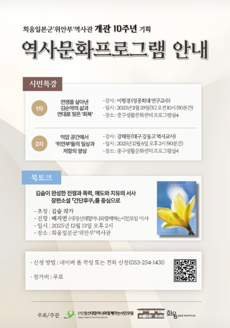 희움일본군 '위안부' 역사관 개관 10주년 기획 역사문화프로그램 안내 ●시민특강 <억압 공간에서 '위안부'들의 일상과 저항의 양상> -강사 : 강태원(대구 강동고 역사교사) -일시 : 2025년 12월 6일 오후 2시 -장소 : 중구생활문화센터 프로그램실4 ●북토크 <김숨이 완성한 전쟁과 폭력, 애도와 치유의 서사 장편소설『간단후쿠』를 중심으로> -초청: 김숨 -진행: 배지연 ((사)정신대할머니와함꼐하는시민모임 이사) -일시 : 2025년 12월 13일 오후2시 -장소 : 희움일본군'위안부'역사관 ※자세한 내용은 아래의 이미지를 클릭해 주세요. |