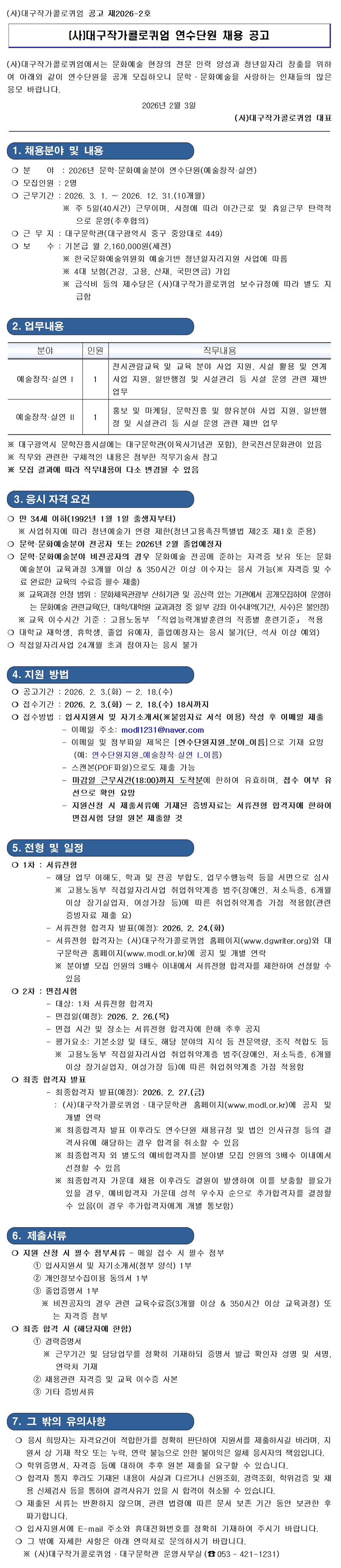 | [공고] (사)대구작가콜로퀴엄 2026년 문화예술 연수단원 채용 공고 |