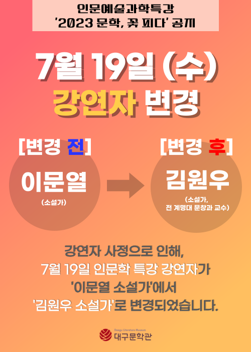 ※인문예술과학특강 <2023 문학, 꽃 피다> 일정 변경 알림※ '김원우(소설가, 전 계명대 문예창작과 교수)로 변경되었습니다. → [변경 후] 김원우 소설가(전 계명대 문예창작과 교수)