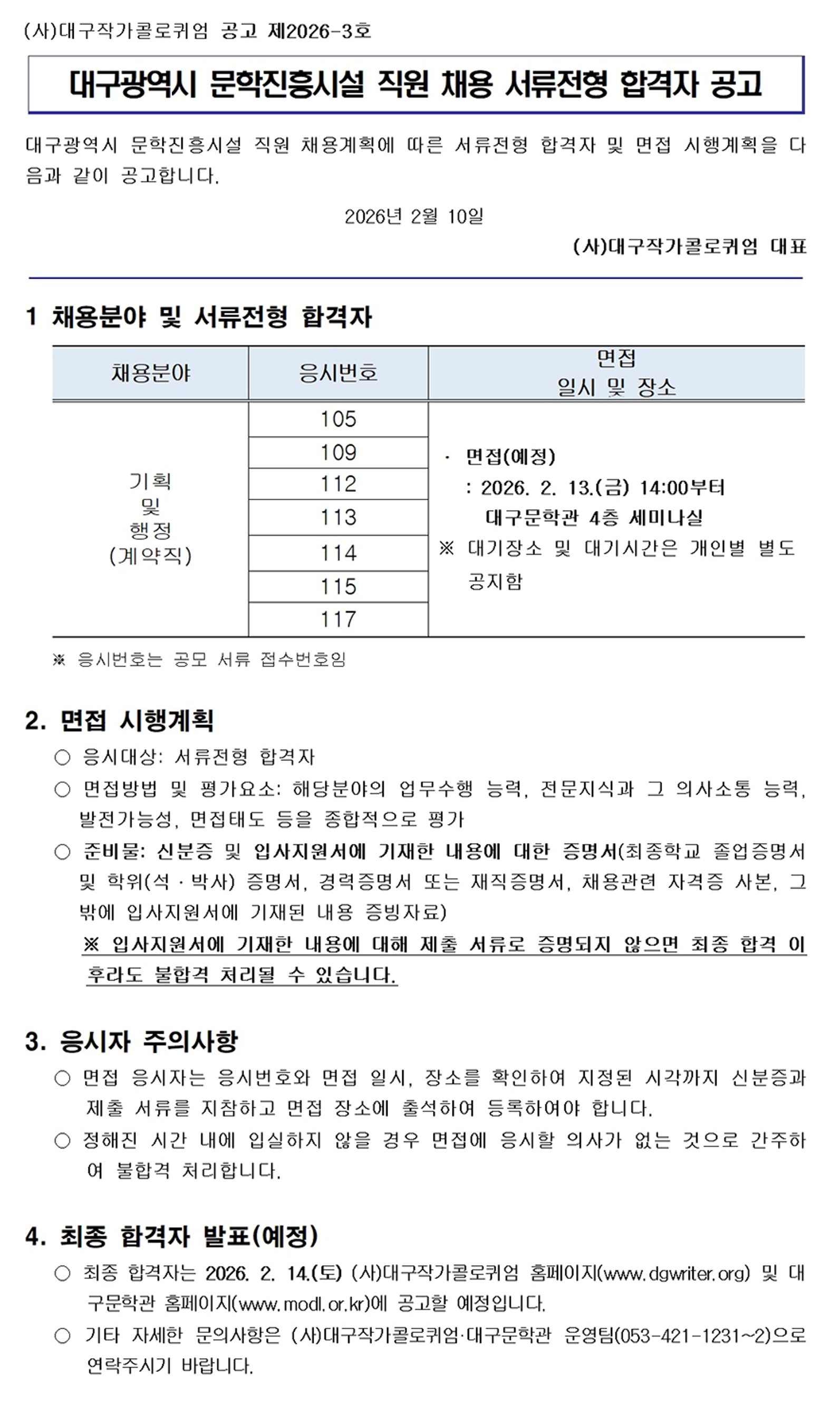 [공고] 대구광역시 문학진흥시설 직원 채용 서류전형 합격자 공고