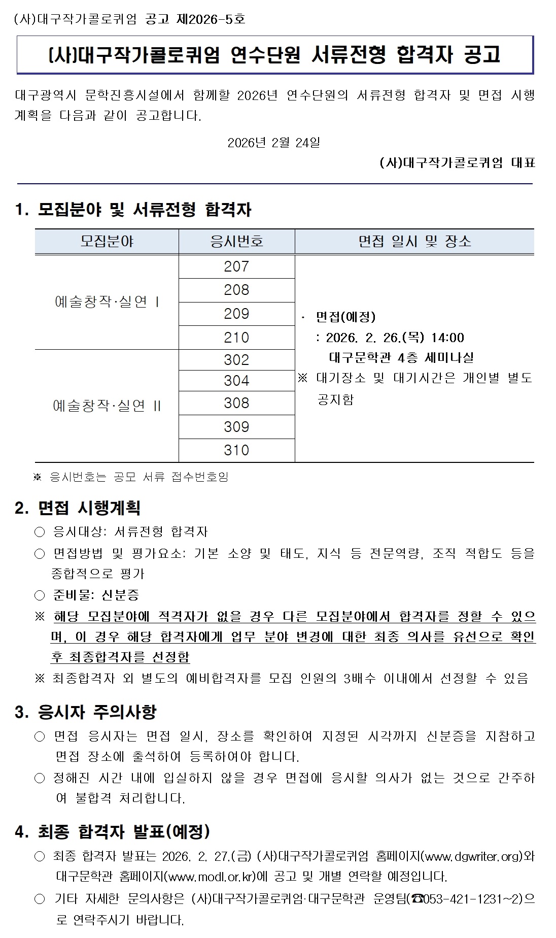 | [공고] (사)대구작가콜로퀴엄 연수단원 서류전형 합격자 공고 |