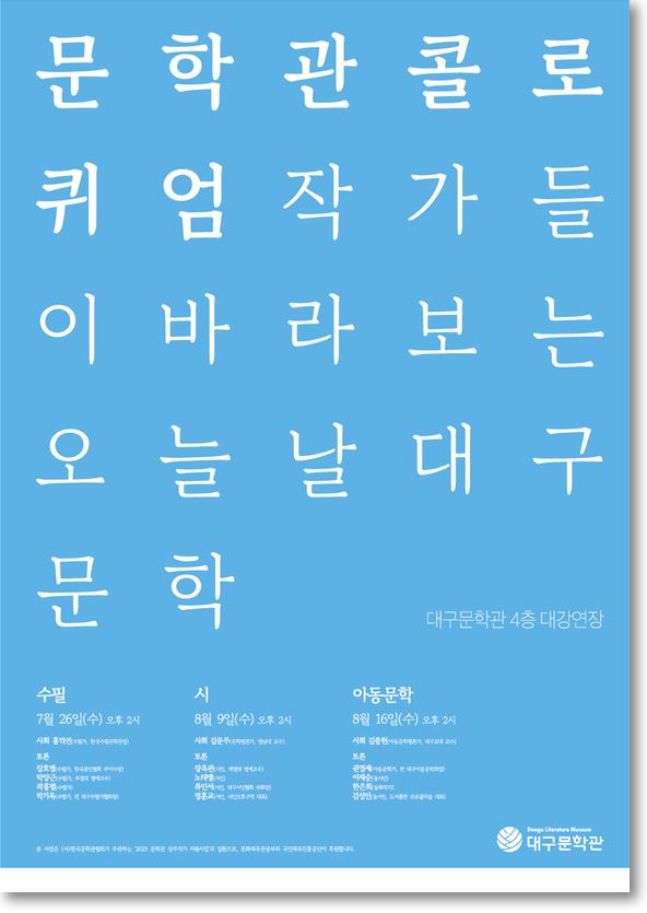 대구문학관이 지역 문학계의 다양한 의견과 생각을 공유하고자 새로운 토론 프로그램 ‘문학관 콜로퀴엄’을 마련했습니다. 콜로퀴엄(Colloquium)이라는 이름에 걸맞게 자유로운 토론 방식으로 진행되는 이번 행사는 ‘작가들이 바라보는 오늘날 대구문학’을 주제로 ‘수필’, ‘시’, ‘아동문학’ 세 장르의 작가들을 초청해 각 분야별 주요 현안과 해결책 등을 살펴보고자 합니다. 우리 지역 문학의 현재와 미래를 함께 고민하고 살펴볼 수 있는 이번 행사에 여러분의 많은 관심과 참여 부탁드립니다.