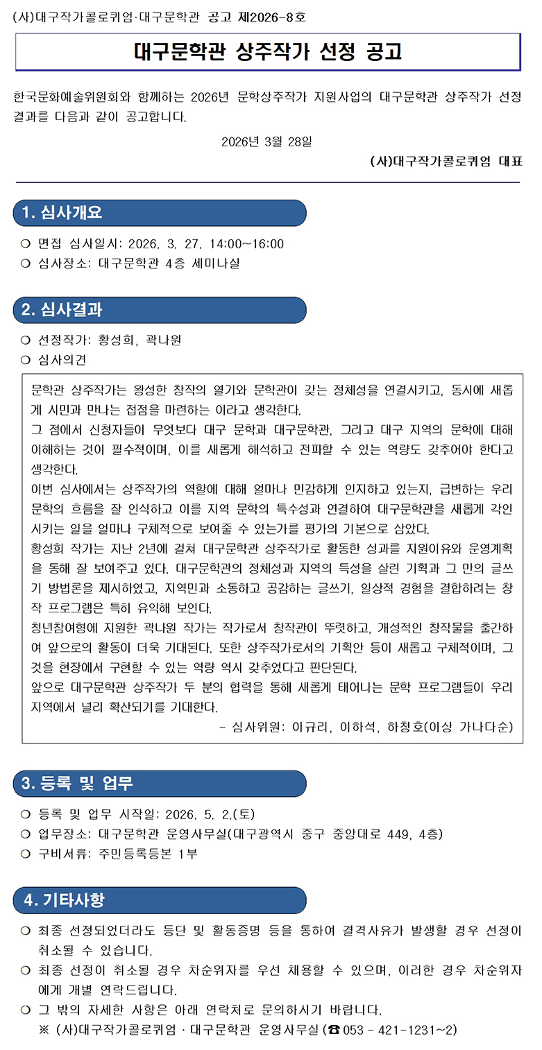 [공고] 2026년 대구문학관 문학상주작가 선정 공고