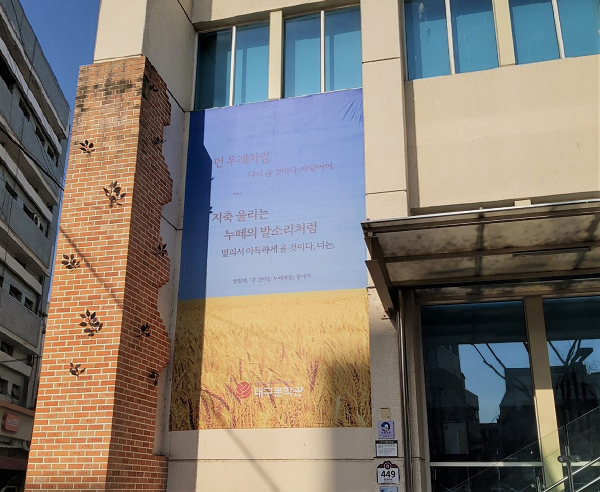 대구문학관 시민글판 대구문학관 시민글판이 새로 단장하였습니다. 이번 글판은 우크라이나의 평화를 기원하는 의미를 담기 위해 우크라이나 국기를 떠올리게 하는 배경과 엄원태 시인의 시 '강 건너는 누떼처럼'의 일부를 발췌하여 실었습니다.