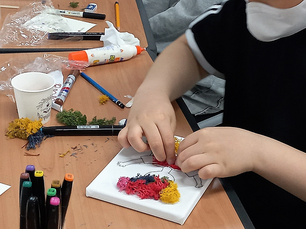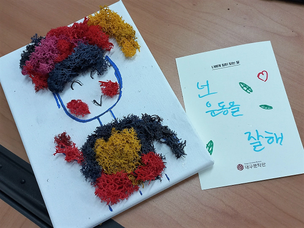 도란도란 문학여행 <도란도란 문학여행>은 7세~초등학교 6학년 어린이 대상의 문학 체험 프로그램으로 문학 전문 강사와 함께 대구문학관의 아동문학 소장자료와 전시를 감상하고 자신의 생각과 감정을 자유롭게 표현해보는 창작 활동입니다. 아동문학가 이오덕의 '꿩'에 대해 이야기를 나누고 이끼를 활용하여 용감하고 자신감 넘치는 자신의 모습을 담아내고 있네요.